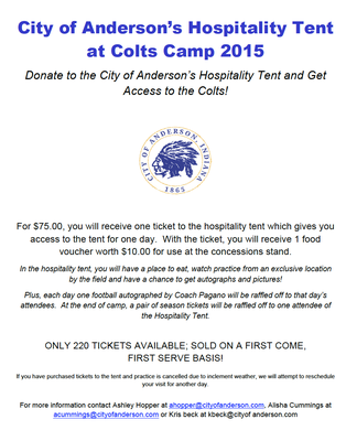 Tickets are available for the City of Anderson's Colts Camp Hospitality Tent (see image below)