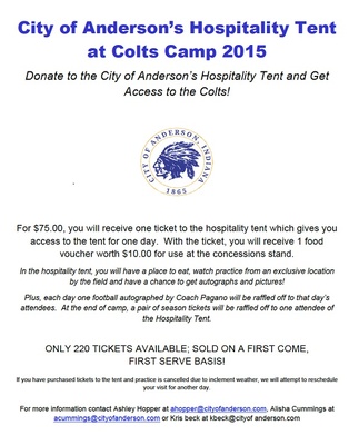 Tickets are available for the City of Anderson's Colts Camp Hospitality Tent (see image below)