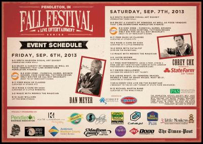 Pendleton Indiana Fall Festival & Entertainment Date and Time Friday Sep 6, 2013 Saturday Sep 7, 2013 Pendleton Indiana Fall Festival & Ent... Set a Reminder Enter your email address below to receive a reminder message. Email address Select the amount of Days before the event -- Select Days Before Event -- 1 Day 2 Days 3 Days 1 Week Captcha Validation Please complete the Captcha Submit Description Images Gallery Image × Set a Reminder Enter your email address below to receive a reminder message. Email address Select the amount of Days before the event -- Select Days Before Event -- 1 Day 2 Days 3 Days 1 Week Captcha Validation Please complete the Captcha Submit Share × Print Email Add to Calendar Facebook Twitter LinkedIn Tell a Friend × Select Calendar Type × Google Yahoo iCal (Outlook, Apple, or other)